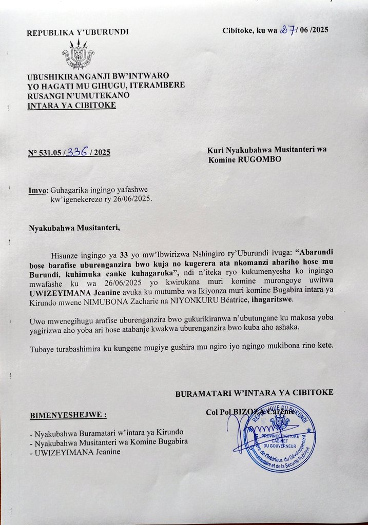 Face à ce qu’il qualifie de violation des libertés fondamentales, le gouverneur de la province de Cibitoke, Bizoza Carême, a réagi fermement. Dans une lettre datée du 27 juin 2025, il a suspendu la décision de l’administrateur communal, rappelant que l’article 33 de la Constitution burundaise garantit à tout citoyen le droit de circuler et de s’établir librement sur l’ensemble du territoire national.